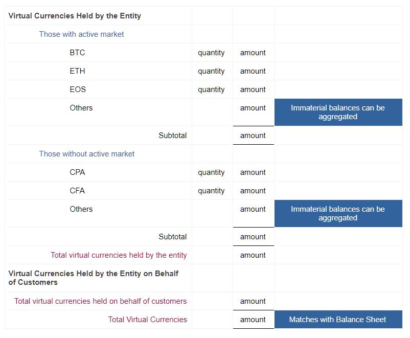 - amount for each type of virtual currency (virtual currencies with immaterial balances can be aggregated)